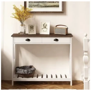 طاولة كونسول مع أدراج، طاولة أريكة خشبية ضيقة مع رف تخزين سفلي للمدخل، الرواق، غرفة المعيشة – بيض/ بني