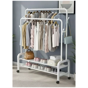 منشر ملابس وحامل شماعات متحرك للملابس والقبعات والشنط، 2 قضيب لتعليق الملابس و2 رف تخزين للشنط والأحذية (أبيض)